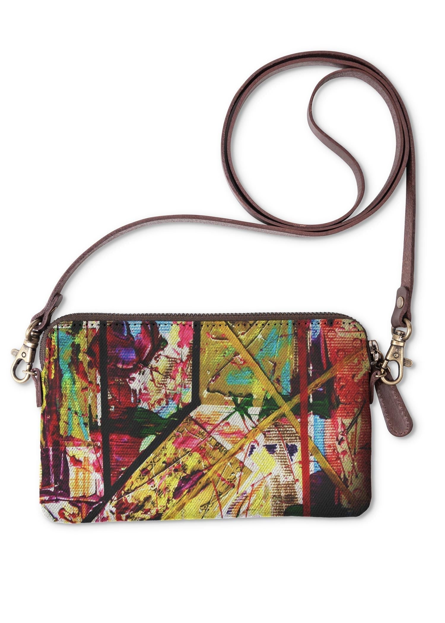 Make a statement with this clutch. Crafted from genuine leather and canvas and adorned with original art by independent designers.